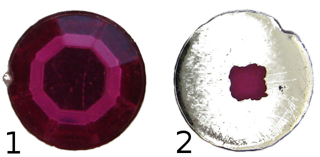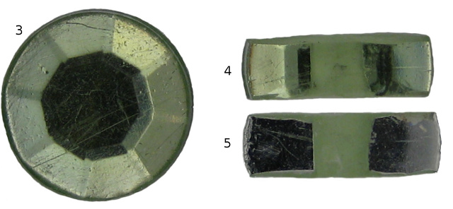 Cut off a rectangle from a round gemstone. Scratch off a square in the middle of the back-reflector. ![]() 3 : Top view, 4 : after cutting, scratching 5 : bottom view |